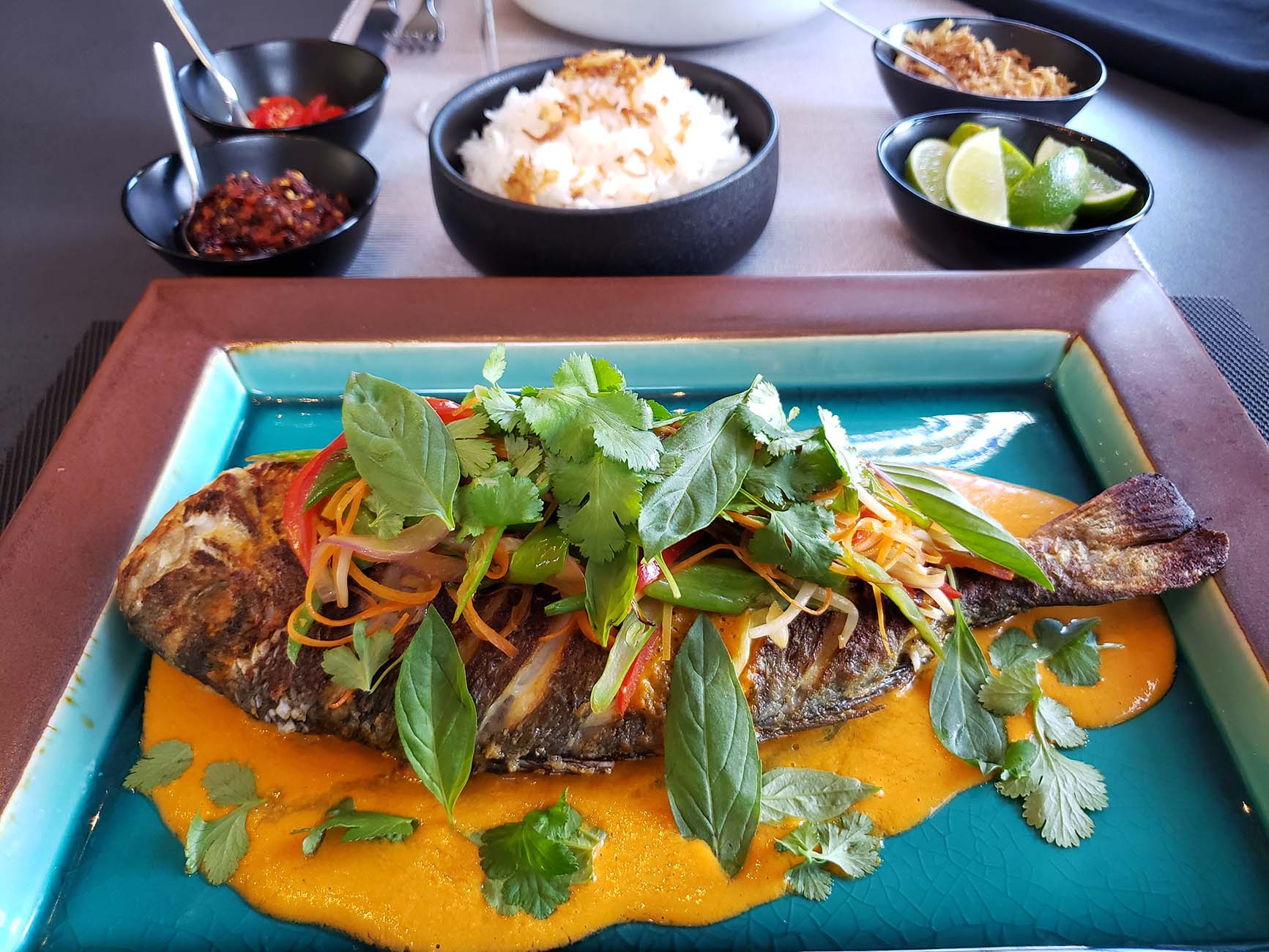 Grilled Tiger Prawns | Red Curry Sauce | Asian Salad | Crispy Noodle