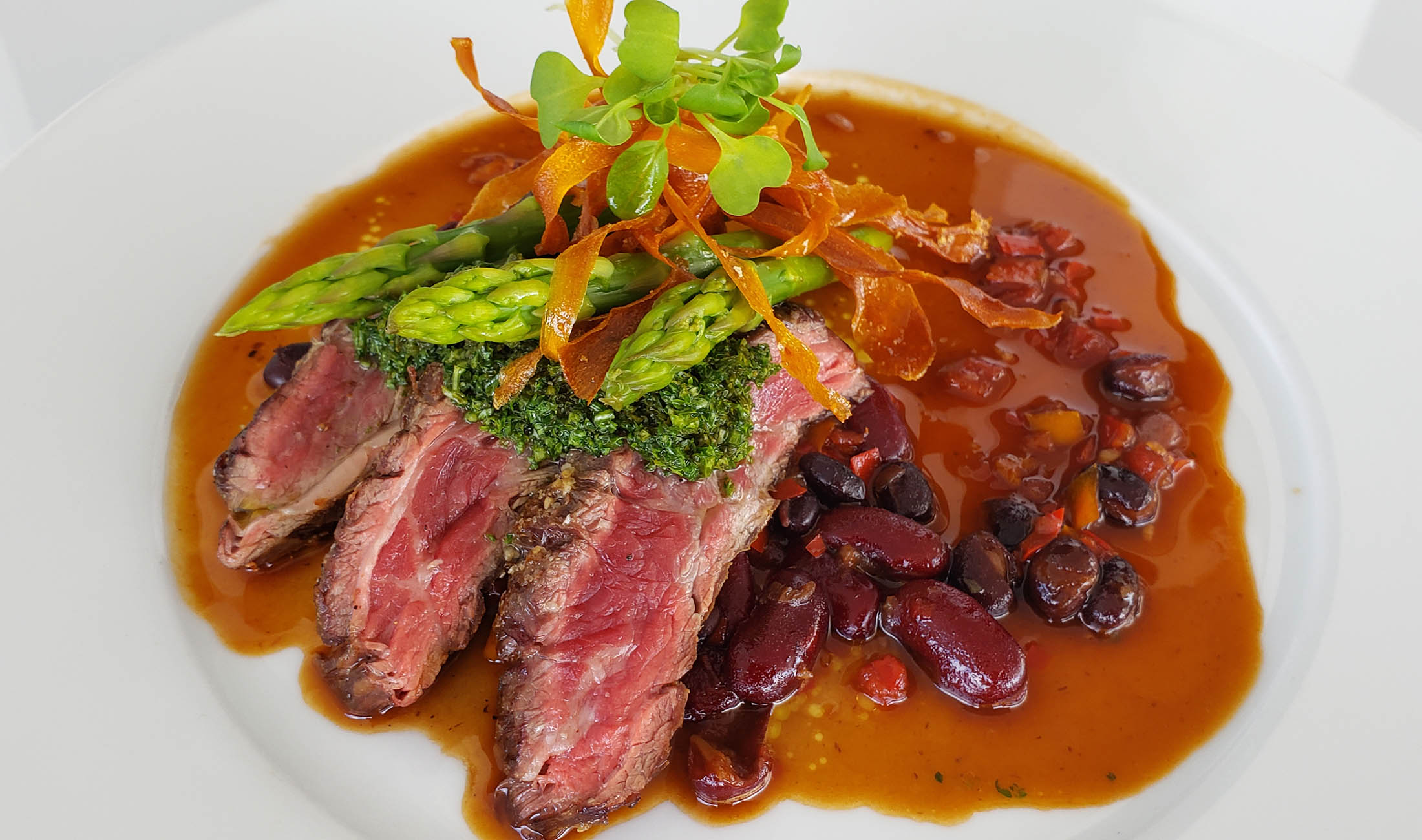Seared Sous Vide Picanha | Roasted Sweet Potato | Sautéed Vegetables | Red Curry Sauce | Coriander